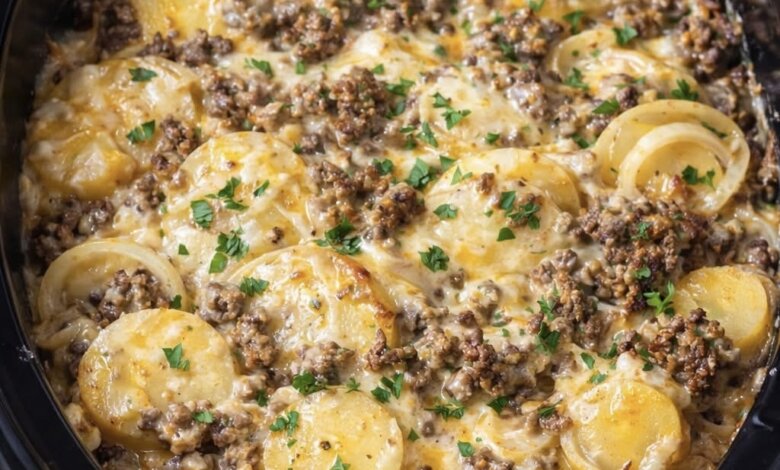 A cheesy, hearty comfort meal made with tender potatoes, seasoned beef, and creamy sauce.