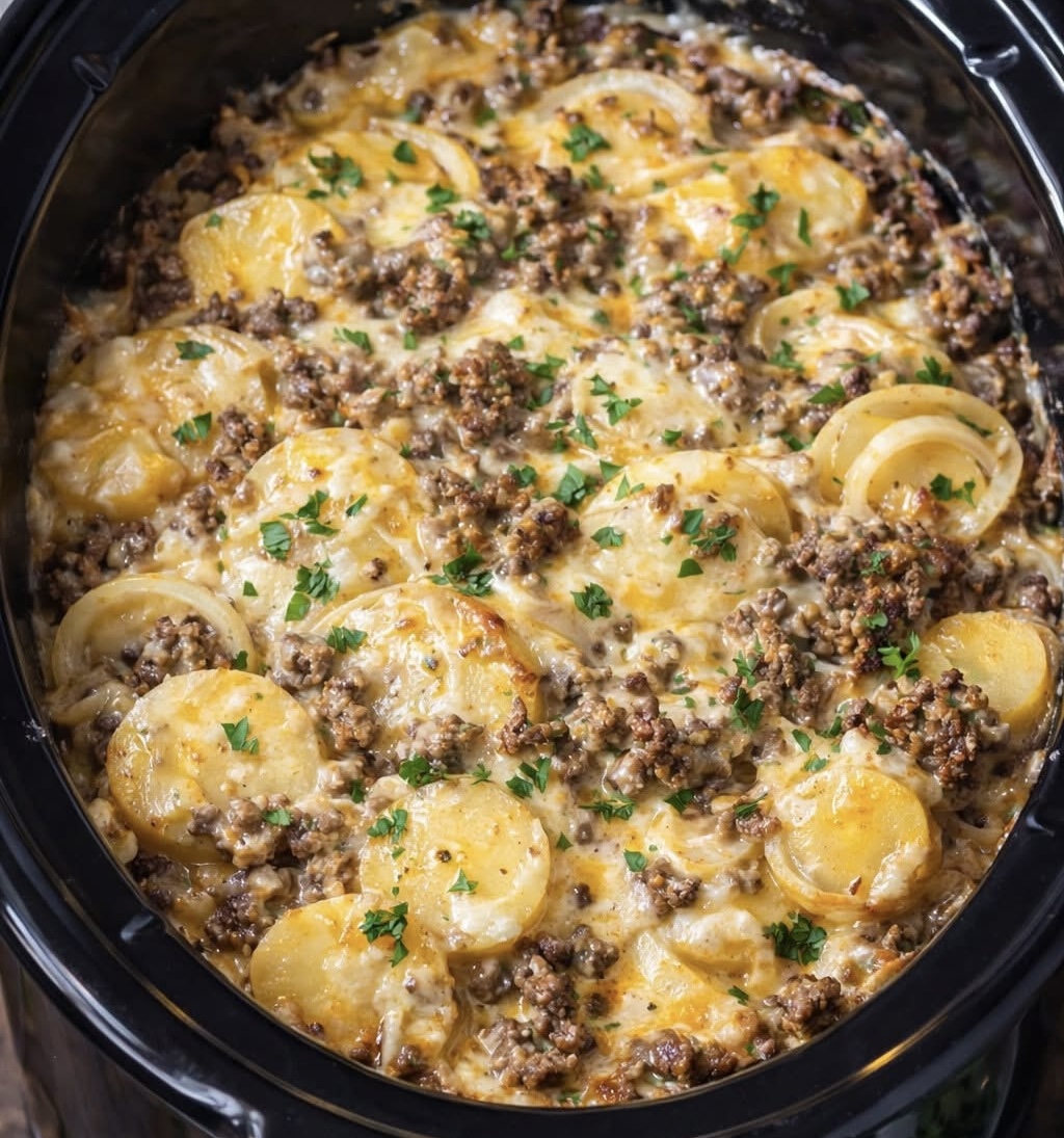 Slow Cooker Beef and Potato Au Gratin