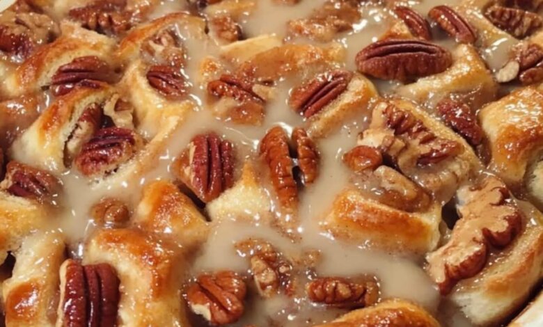 - In a large bowl, mix cinnamon roll pieces, apple pie filling, and chopped pecans.