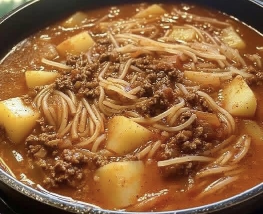 A cozy, flavorful soup made with ground beef, potatoes, and noodles simmered in a tomato broth — pure comfort in a bowl.