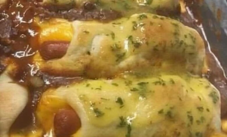 - Roll crescent dough around some of the hot dogs and place on top.