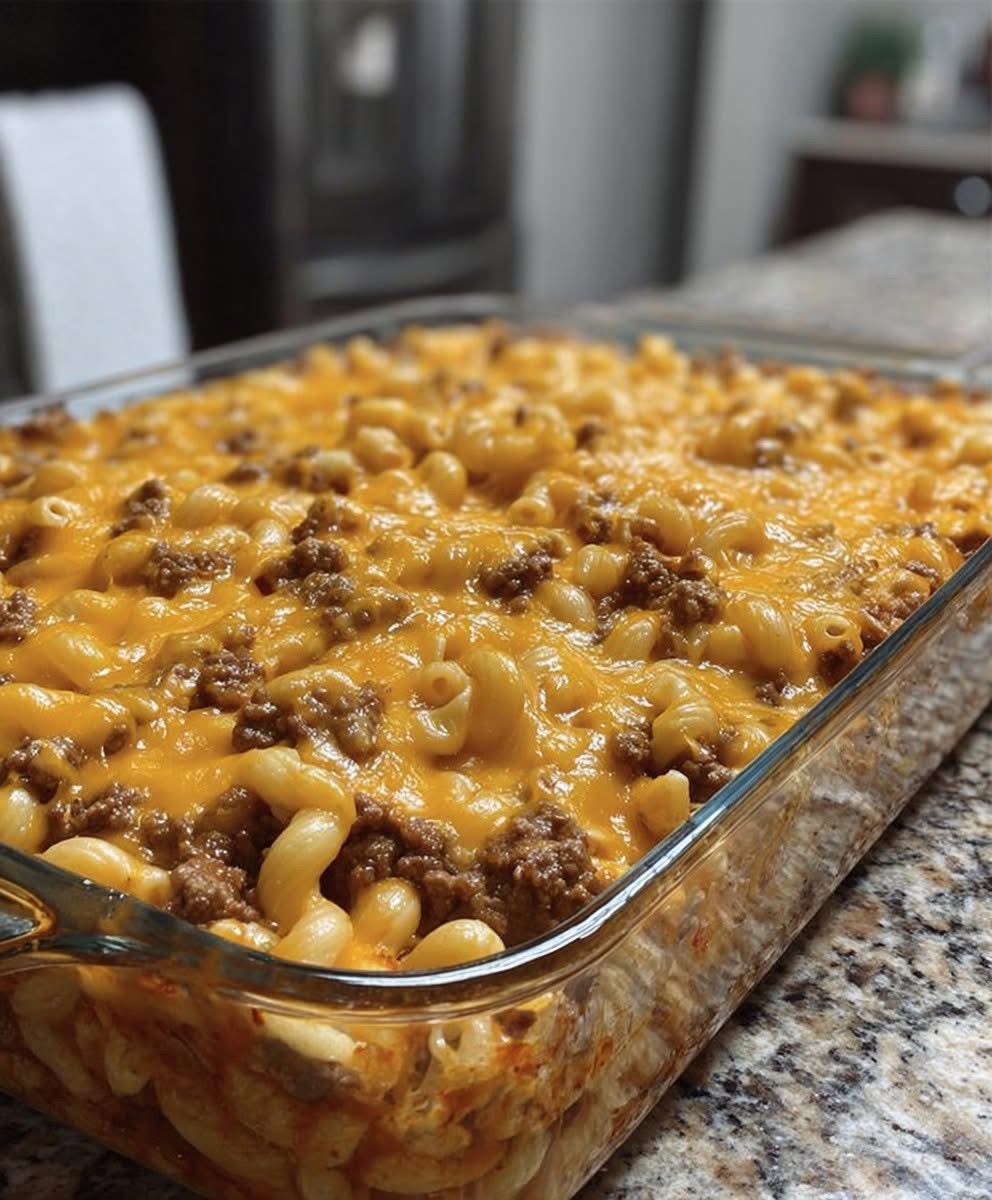 - In a baking dish, combine cooked macaroni and beef mixture.