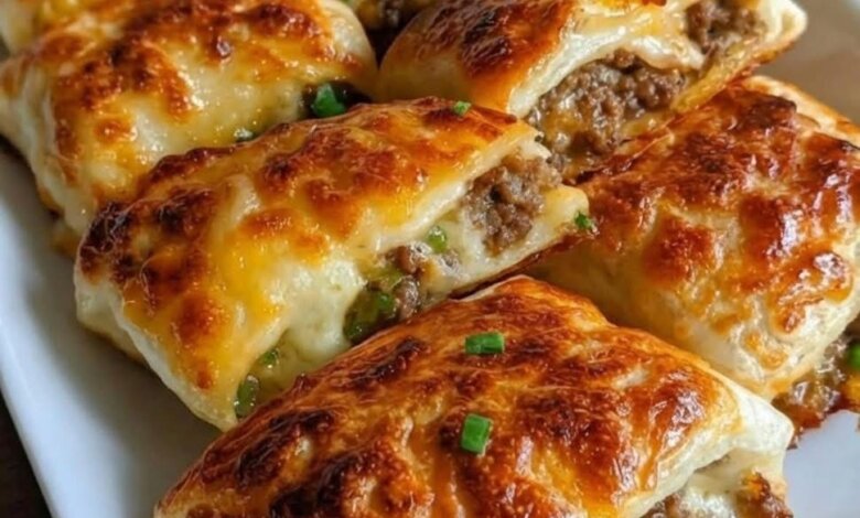 These cheesy beef stuffed crescent rolls are golden, flaky, and packed with savory flavor — definitely a winner.
