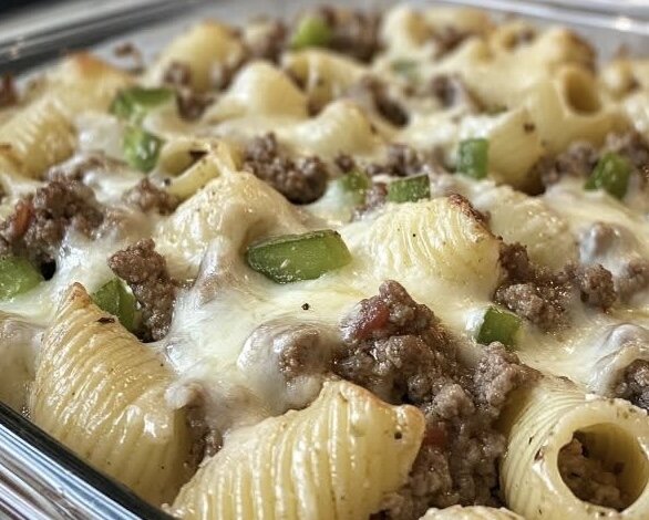Shells + savory beef + peppers + a molten provolone-mozzarella sauce baked to bubbly perfection.