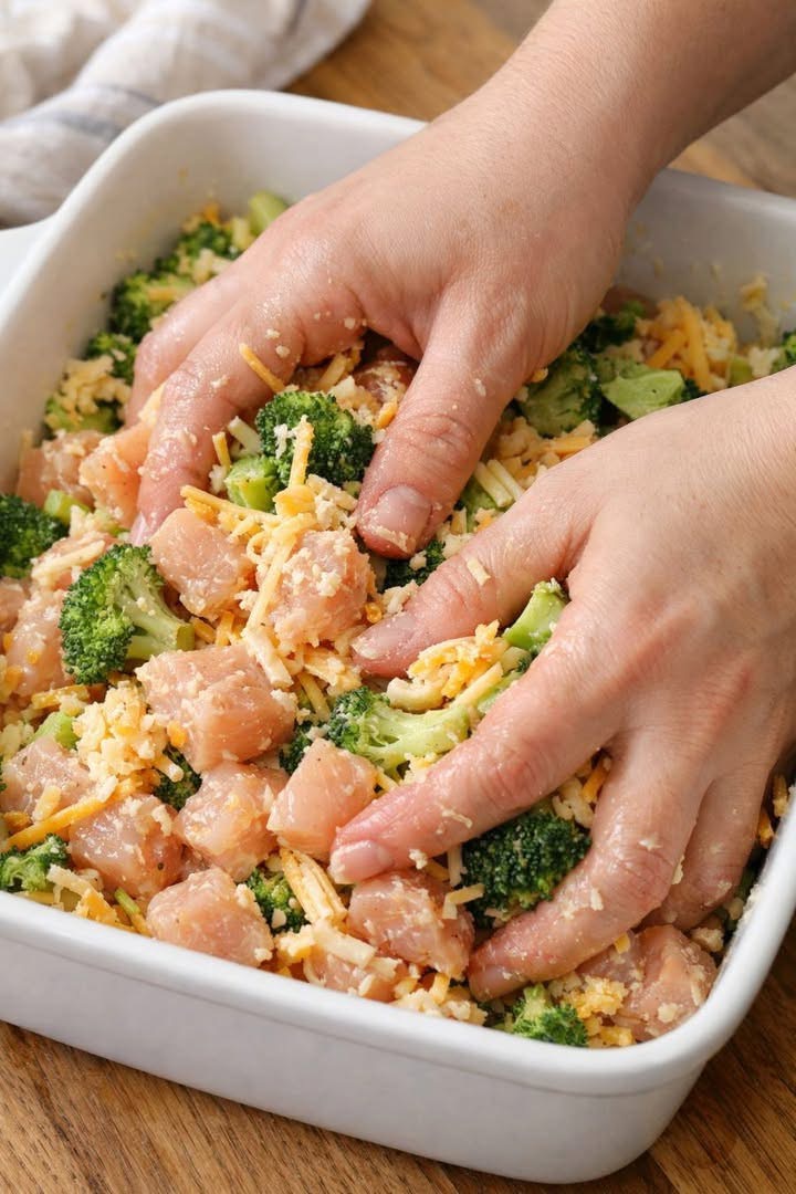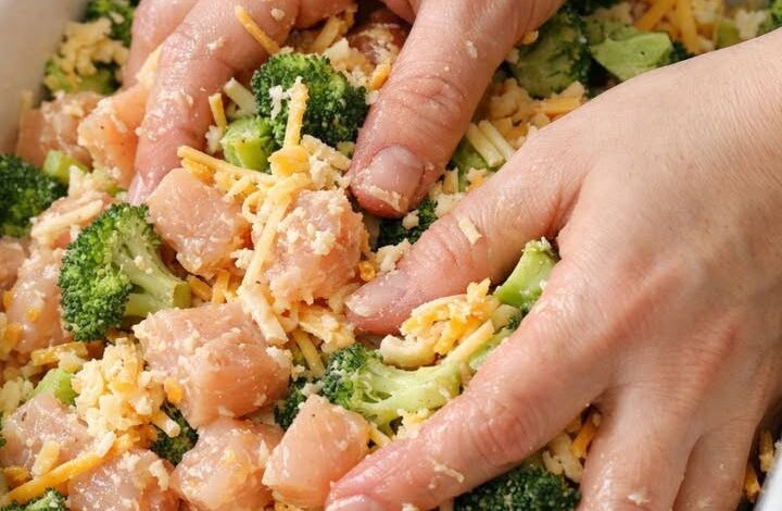 - In a baking dish, add chicken and broccoli.