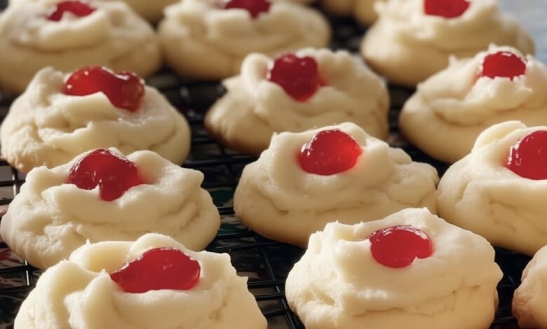 4. Portion the dough: use a small cookie scoop or teaspoon to drop rounded portions onto the prepared sheets, leaving 1″ between cookies. Gently flatten each mound and press a cherry half into the center.