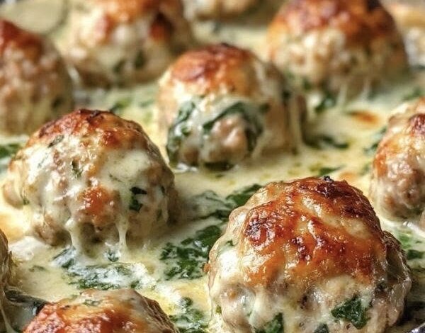 A rich, cheesy, comforting dish featuring tender chicken meatballs baked in a creamy, flavorful sauce.
