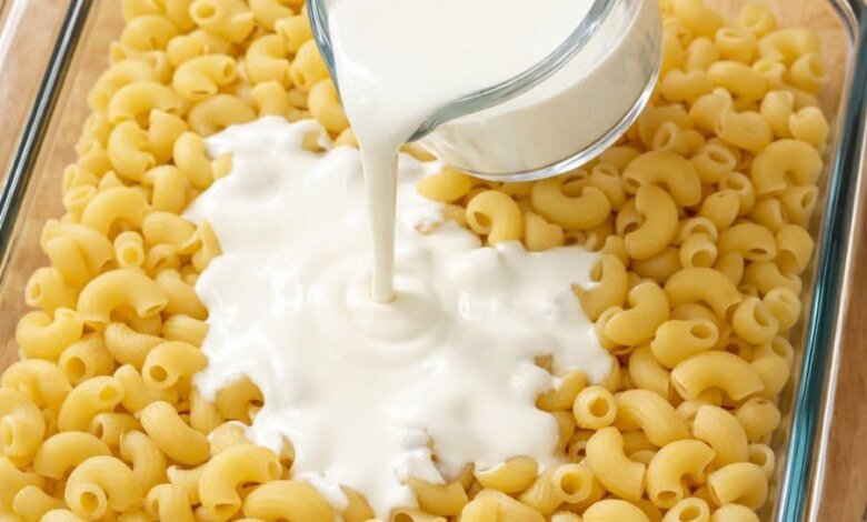 Pour the heavy cream evenly over the macaroni.