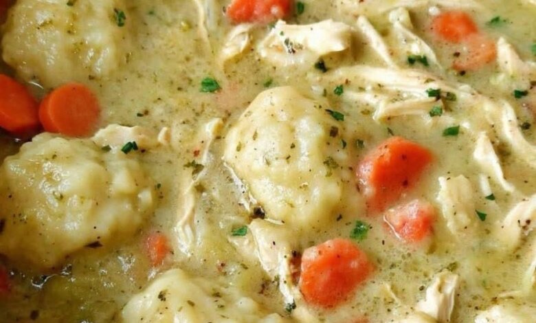 - Drop spoonfuls of dumpling dough into the simmering soup.