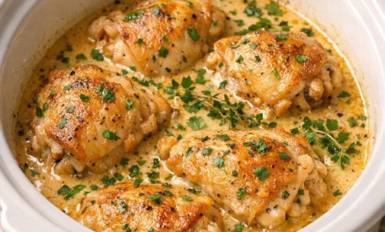 Creamy Garlic Chicken Thighs (Slow Cooker Recipe)