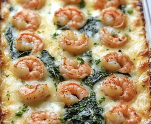 A golden, cheesy shrimp bake layered with creamy sauce and tender spinach. Perfect for seafood lovers!
