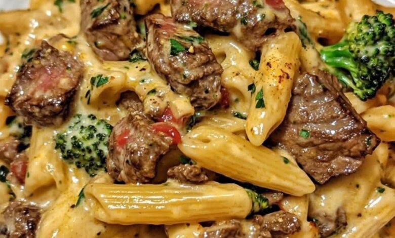 Creamy Steak Bites Penne with Broccoli in White Sauce