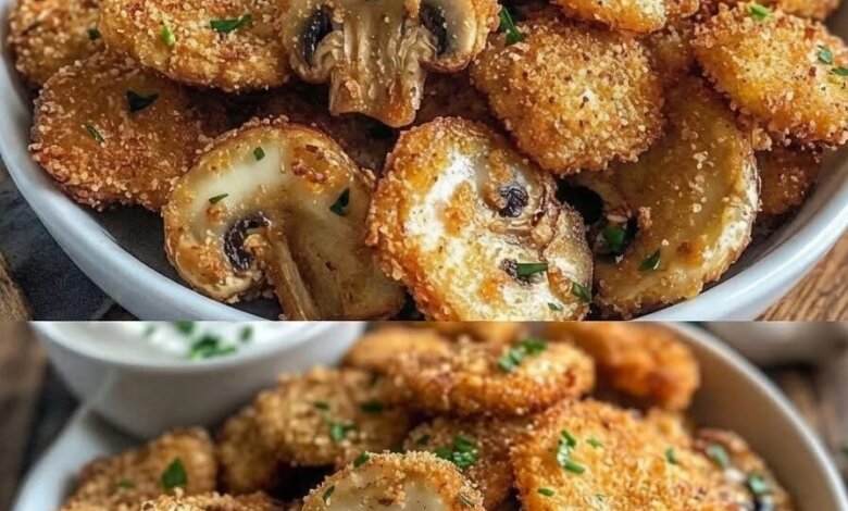 Juicy mushrooms coated in a golden, crunchy breadcrumb crust with rich garlic flavor.