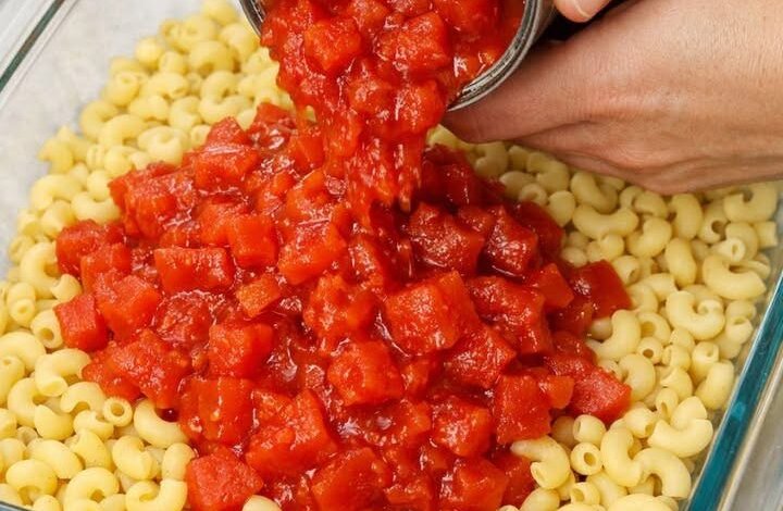 Pour canned diced tomatoes over elbow macaroni with a couple of simple ingredients