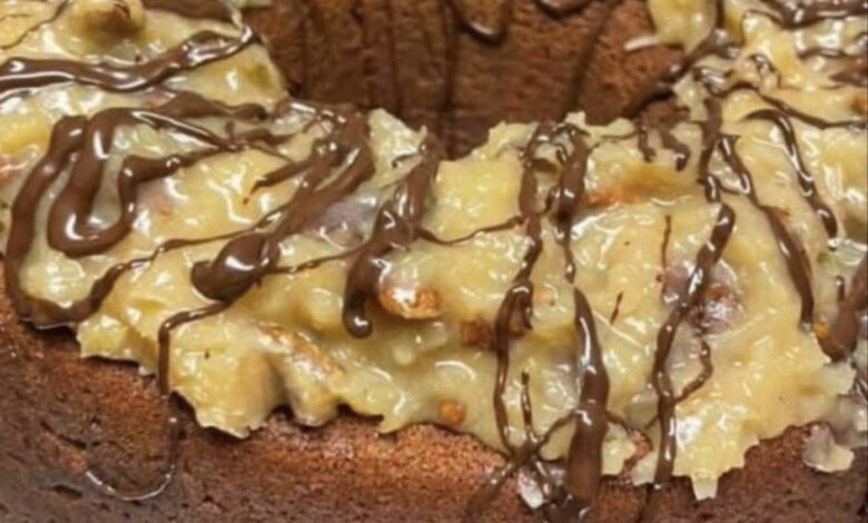 A rich, decadent pound cake topped with creamy coconut pecan frosting and a drizzle of chocolate —