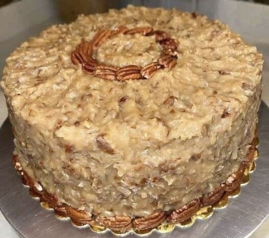- Layer cakes with frosting; finish top and sides. Decorate with pecan halves.