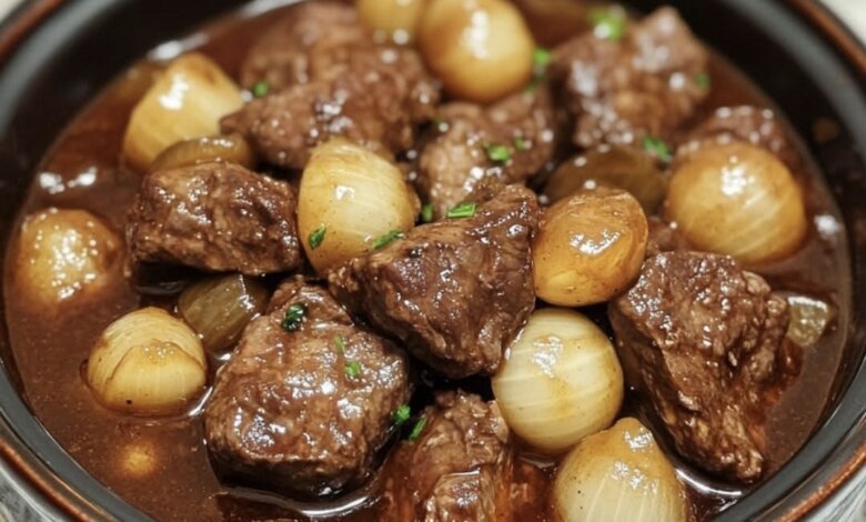 - Add the pearl onions and continue simmering 45–60 minutes, or until beef is very tender.