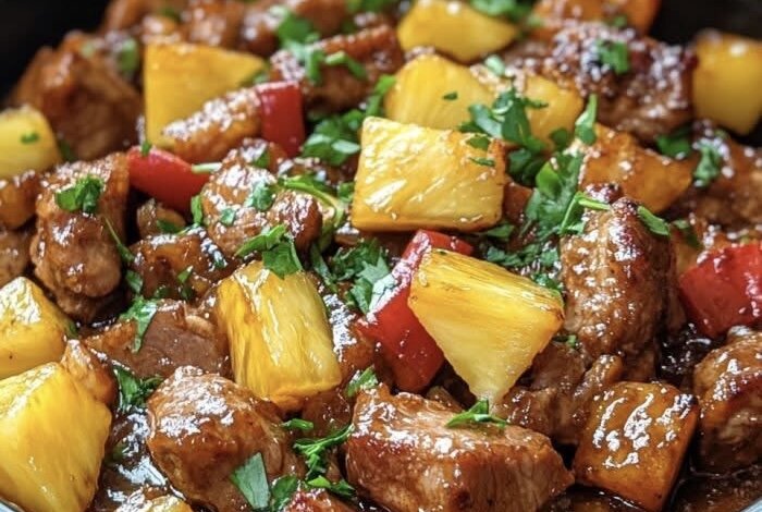 - Whisk together soy sauce, brown sugar, ketchup, garlic, ginger, and reserved pineapple juice. Pour over beef.