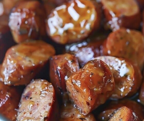 5. Simmer 6–8 minutes until the glaze thickens and coats the sausage.