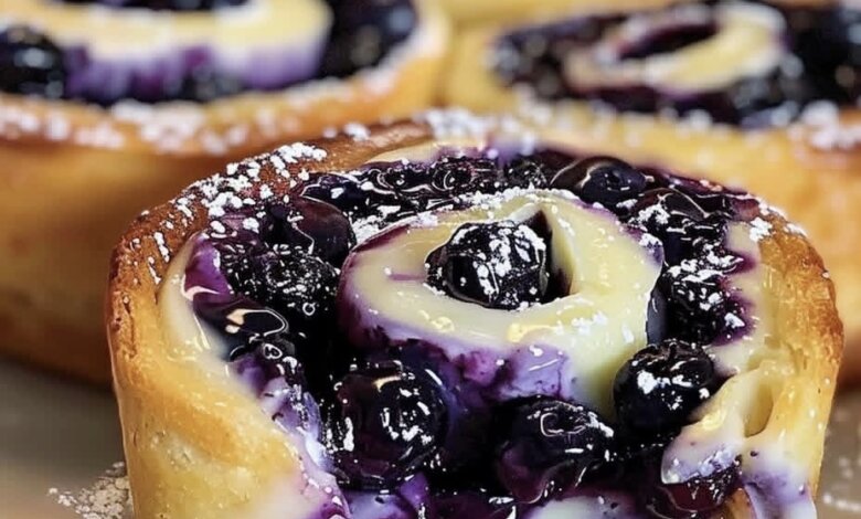 - Assemble: Roll dough into a rectangle between parchment paper. Spread the cheesecake filling, then spoon blueberry mix evenly on top.