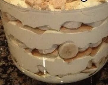 5. In a large serving dish or trifle bowl, layer vanilla wafers, sliced bananas, and pudding. Repeat until all ingredients are used, ending with pudding on top.
