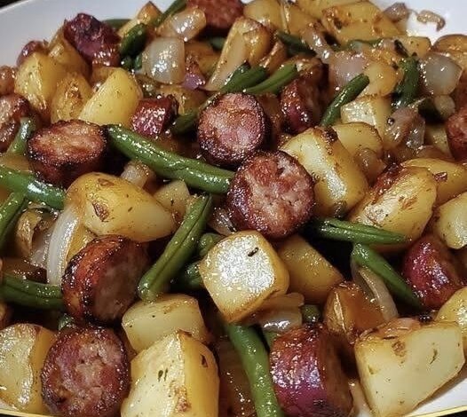 - Add sausage, onions, and green beans to the pan. Mix well.