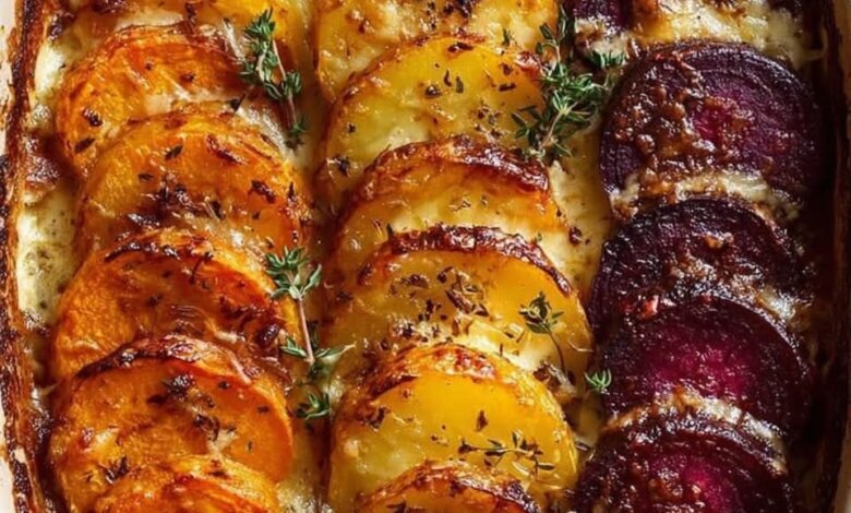 🌿 Root Vegetable Gratin with Sweet Potatoes, Parsnips & Beets