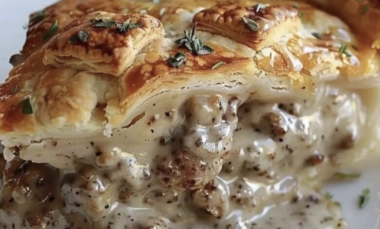 “Flaky, golden pie crust layered with creamy sausage gravy — comfort food at its finest!”