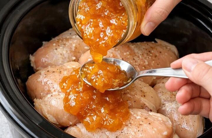 Pour apricot preserves over chicken, plus just one extra ingredient, into the slow cooker for a meal