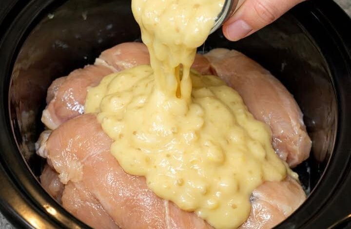 1. Place chicken breasts in the slow cooker.