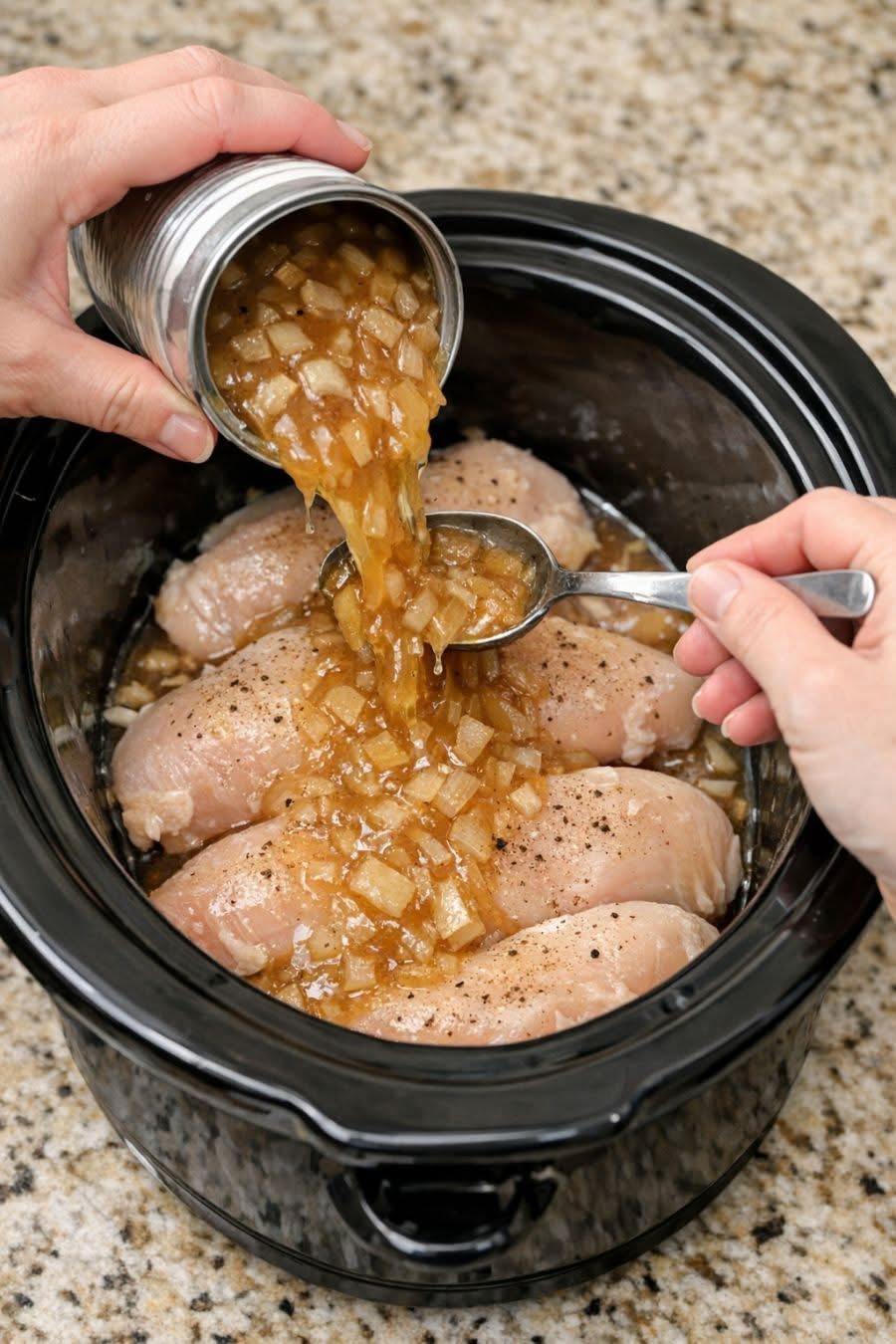 - Pour the French onion soup evenly over the chicken.