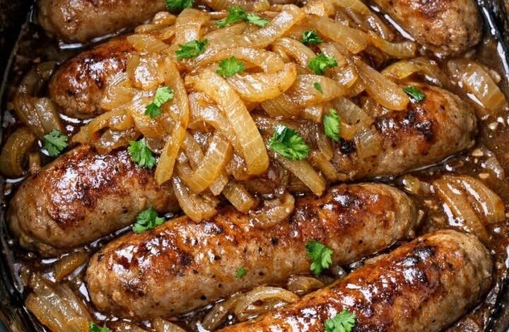 Juicy sausages slowly cook with tender caramelized onions in a savory sauce, creating a hearty dinner