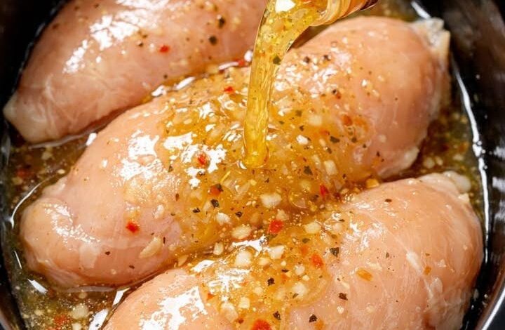 - Place chicken breasts in the slow cooker.