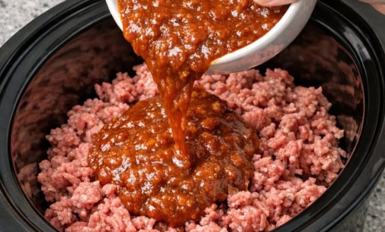 Pour sloppy joe sauce over raw ground beef along with a few simple ingredients in the slow cooker