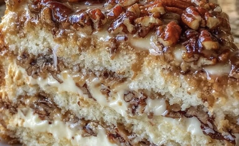 OMG my mouth is watering! This decadent cake features a creamy cheesecake layer nestled between soft white cake layers and topped with a rich coconut-pecan frosting — a true showstopper dessert for any occasion.